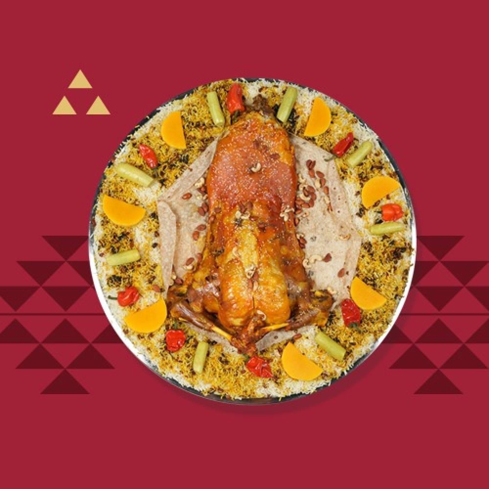 مفطح نعيمي محمّر ويطهى بالبخار ، يُقدّم فوق أرز شعبي مطهو بالمرق مع خضار القصيم والمكسرات ،